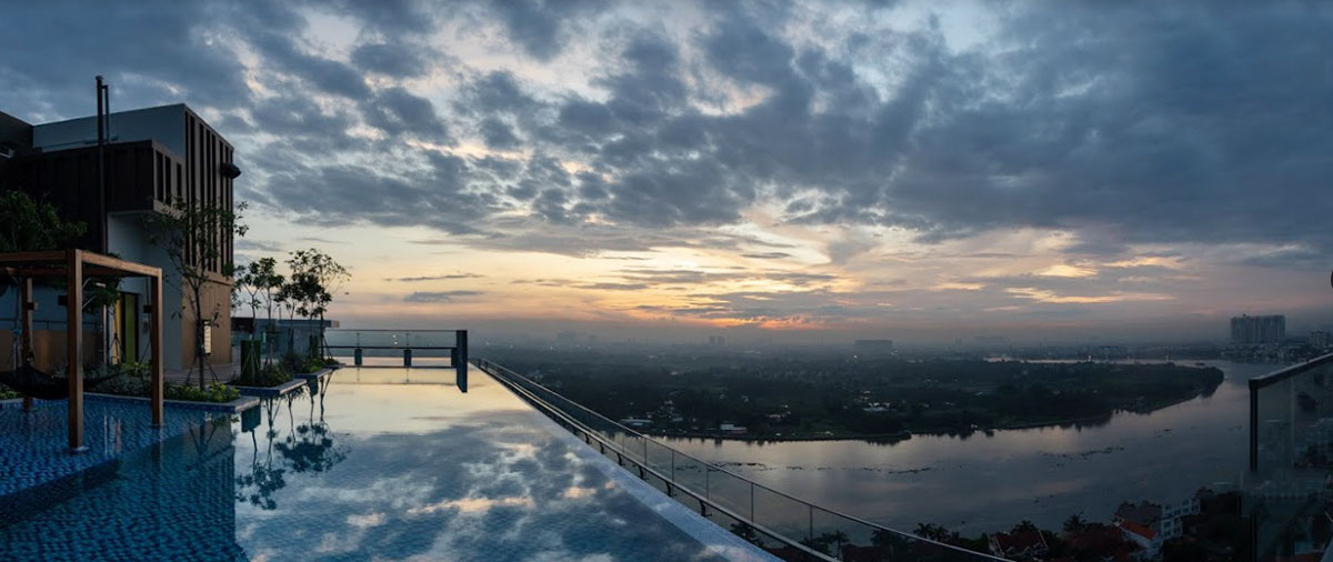 With a scale consisting of two towers, Aire and Breze, connected by a suspended glass-bottomed swimming pool that offers panoramic views of the Saigon River, the project is considered to have many unique highlights with 70 amenities focusing on health, fitness, and well-being for residents.